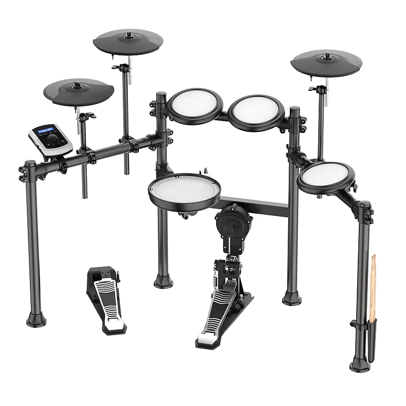 Batteria elettronica professionale con pelli Mesh – Rack a 4 montanti verniciato a polvere colore: nero opaco – Rullante 8″ e 3 piatti in silicone 10″ con tecnologia Dual Zone – 3 Tom 6″ – Pedale e pad Cassa – Pedale Hi-Hat – Centralina di controllo con 350 suoni, 20 drum-kit, 30 ritmi Coach Music e metronomo e Bluetooth – Cavi di collegamento e porta bacchette inclusi