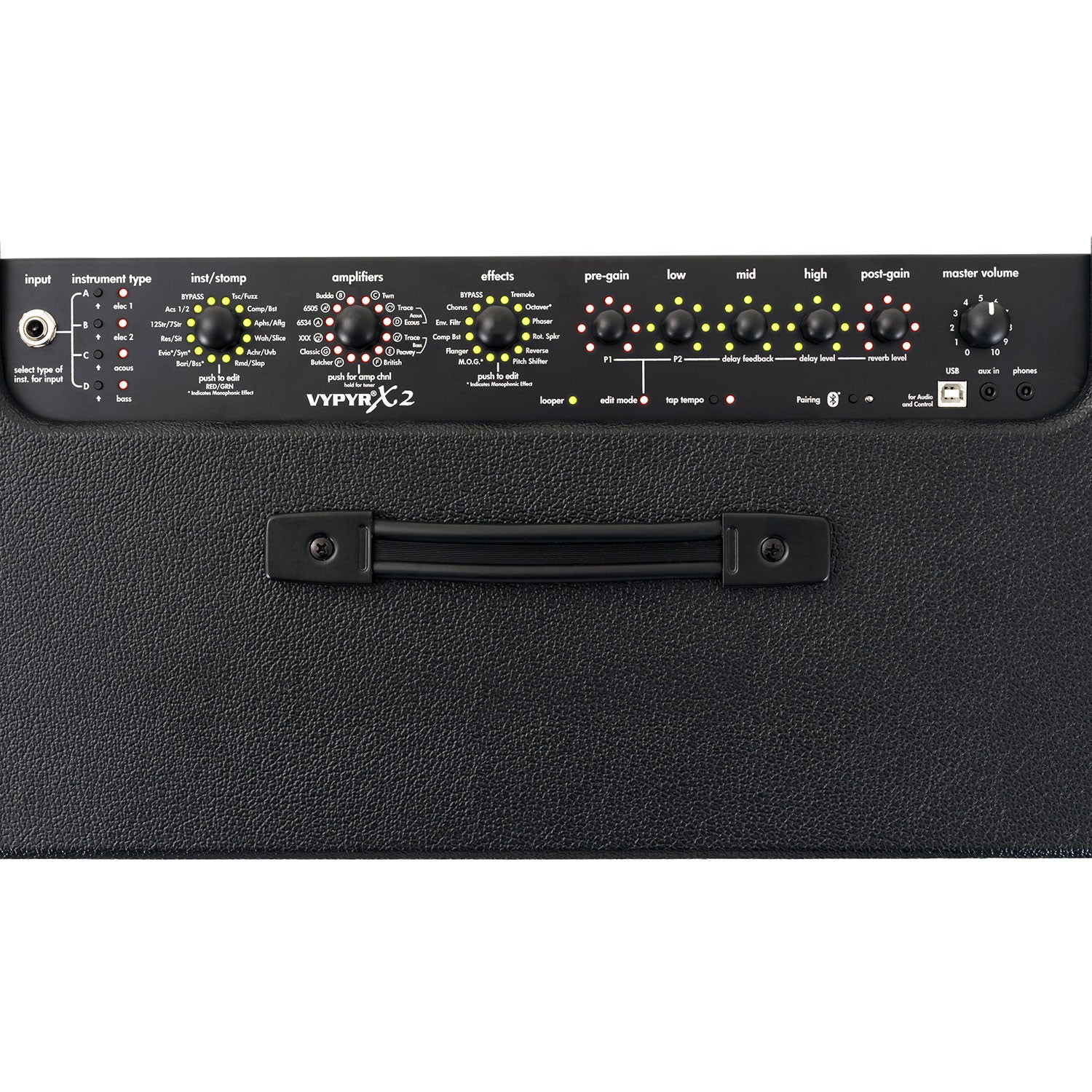 VYPYR X2 (EU) - 60W modeling amp 12" - Modeling amp combo per chitarra acustica, chitarra elettrica e basso 60W RMS transistor con Bluetooth - Serie Vypyr - Estremamente leggero - Design del cabinet con parte posteriore semi-aperto migliorare l'acustica ed aumentare il volume - Dotato delle esclusive tecnologie brevettate VIP (Variable Instrument Performance) che permette all'amplificatore di essere utilizzato con chitarre elettriche, acustiche e basso (si adatta automaticamente allo strumento collegato) e Peavey Analog TransTube distortion (emula la circuitazione valvolare) - Esclusiva interfaccia utente intuitiva e semplice Peavey WYSIWYG (What You See Is What You Get) - iOS app disponibile - 16 Preset programmabili dall'utente - 10 On-Board Instrument Models - 36 On-Board Amps (di cui 6 per chitarra acustica e 6 per basso) - 25 On-Board Effects (di cui 12 Stopboxes) - Accordatore cromatico integrato - Looper integrato programmabile con footswitch Sanpera (non incluso, ma acquistabile separatamente) - Permette di utilizzare fino a cinque effetti simultaneamente con footswitch Sanpera (non incluso, ma acquistabile separatamente) - Dotato di Tap Tempo - La porta USB integrata permette di fare il download degli aggiornamenti del firmware, ma anche di registrare il diretta (senza necessità di alcun driver specifico) sul proprio pc come se il Vypyr fosse una normalissima scheda audio - Coni: 1x12” Custom Peavey - Ingressi: 1x Strumento (Jack 1/4”) + 1x Aux/Line/MP3 (Jack 1/8") + 1x Audio/Control (USB) + 1x Footswitch (Midi) - Controlli: Preset Chitarra Elettrica 1/Chitarra Elettrica 2/Chitarra Acustica/Basso + Inst/Stomp (Bypass + Acs 1/Acs 2 + 12Str/7Str + Res/Sit + Evio/Synt + Basi/Bss + Rmd/Slap + Achr/Uvb + Wah/Slice + Aphs/Aflg + Comp/Bst + Tsc/Fuxx) + Amplifiers (6534 + 6505 + Budda + Twn + Trace Acoustic + Eccous Acosutic + Trace Bass + Peavey Bass + British + Butcher + Classic + XXX) + Effects (BYPASS + Chorus + Envelop Filter + Compressor + Flanger + M.O.G. + Pitch Shifter + Reverse + Rotary Speaker + Phaser + Octaver + Tremolo) + Pre-Gain/Program 1 + Low/Program 2 + Mid/Delay Feedback + High/Delay Level + Post-Gain/Reverb Level + Master Volume + Tap/Tempo + Blootooth Pairing On/Off - Uscite: 1x Cuffie (Jack 1/8") + 1x Audio/Control (USB) - Dimensioni: 50,0x45,0x25,5Cm - Peso: 12,5Kg